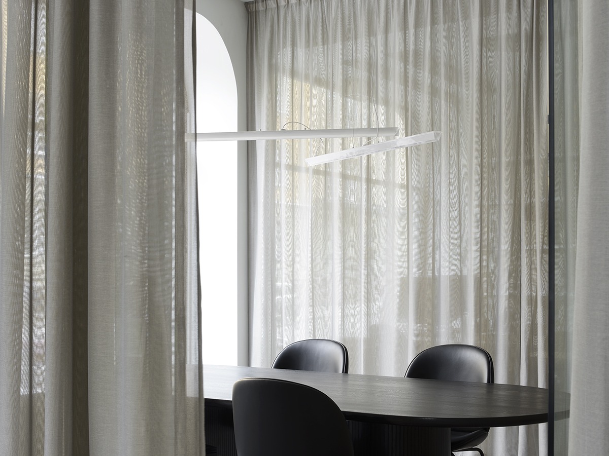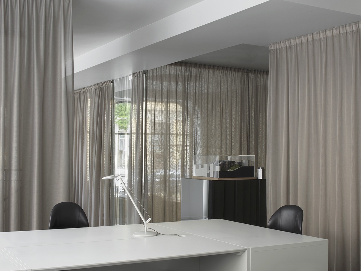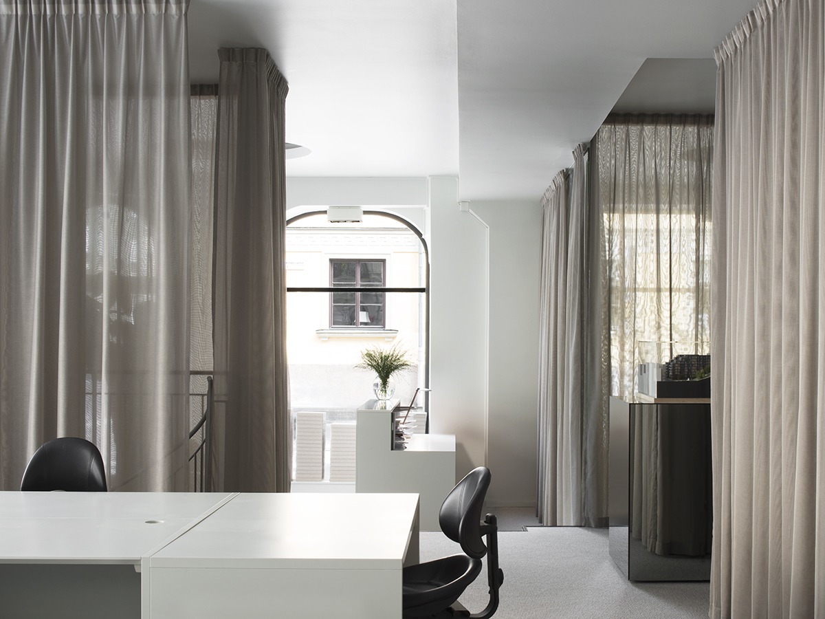 In the larger of the two offices, where activities collided in a space that was much too open, the plan was structured to draw out and make the most of the different functions, levels and light conditions. Curtains are used to create a mix of open and enclosed spaces.