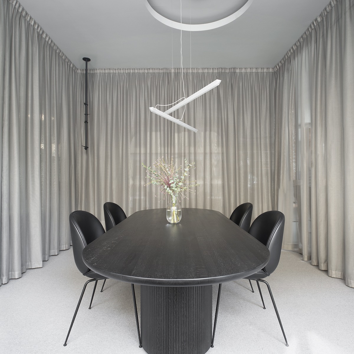 The curtains are hung in box shapes, framing and concealing glazed sections, stairs and technical installations. When the curtains are opened, new sight lines appear through the room. A homogenous grey-beige colour scheme helps tie the space together.