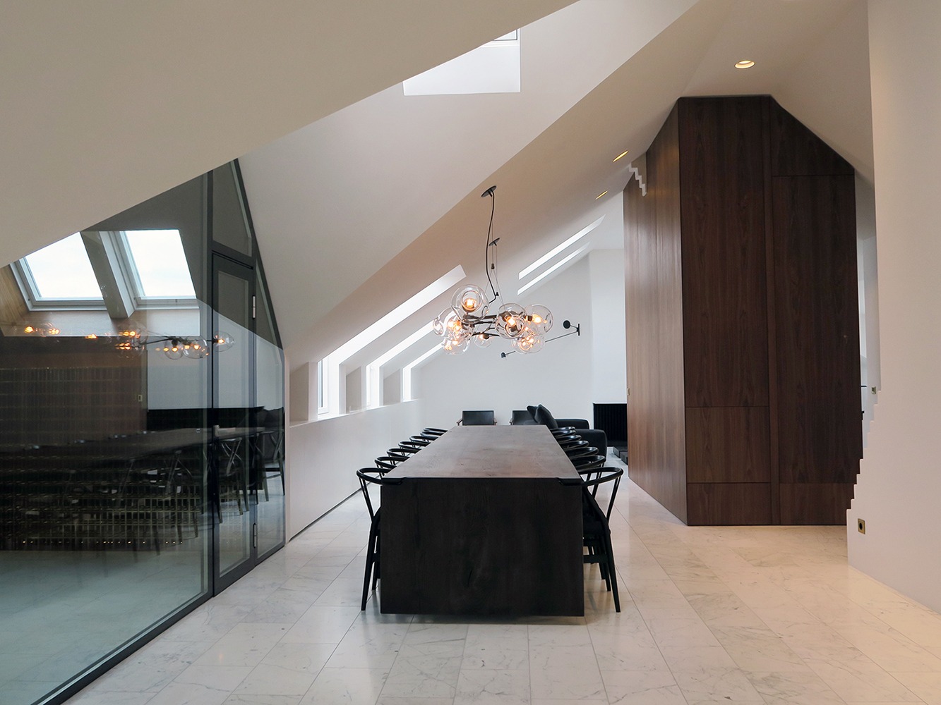 A set of recurrent material and colors runs through everything. On the modern styled attic, the white statuario marble unites the floors of the open areas, and in the master unit the floors, most of the walls and all the carpentry is done in wenge.