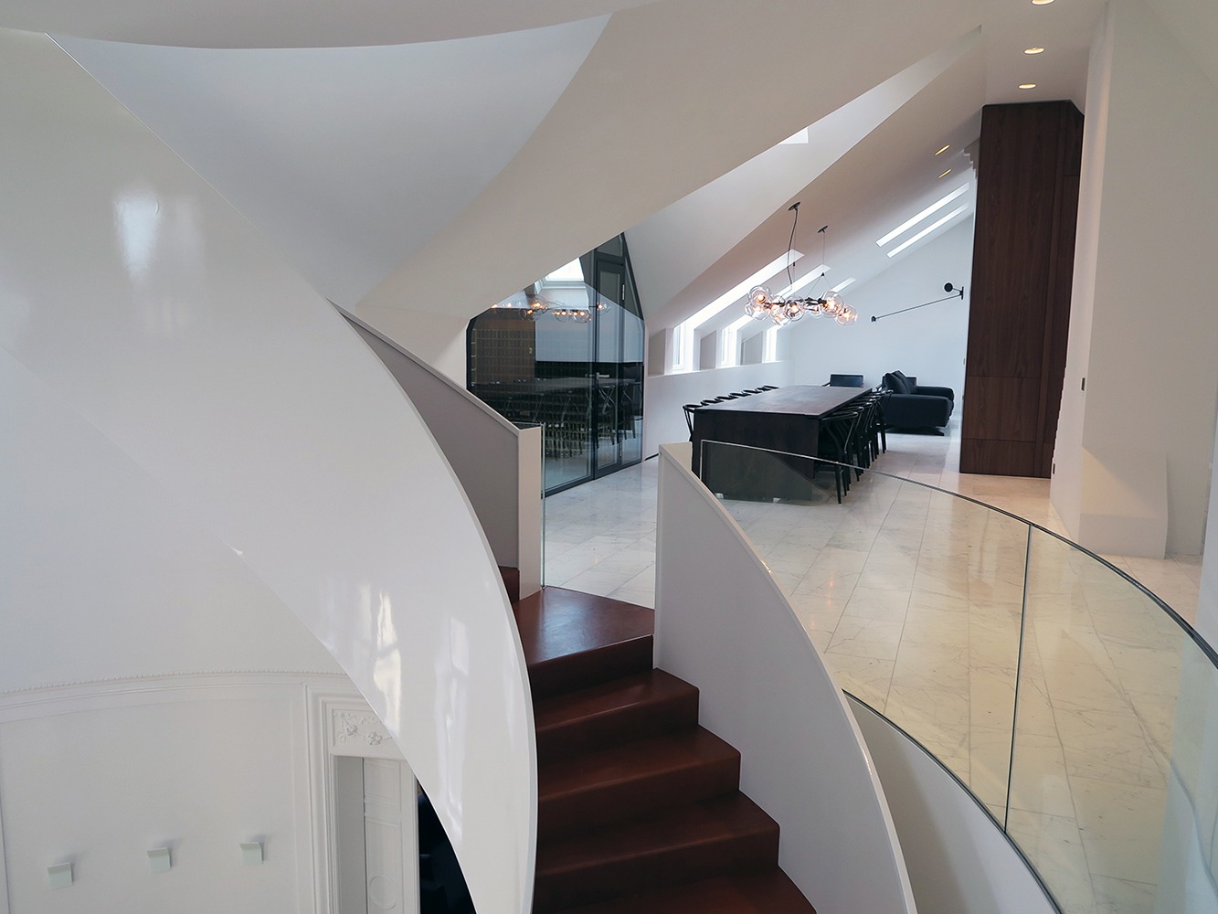 The client wanted an apartment that was full of surprising moments. It was done as a set of individual events. A luxury tool-box. Every different type of space was treated to have its unique features. One of the main features is the big spectacular stair that ties the floors together as a central core. Another spectacular thing is the apartments seven bathrooms, all done in different stones.