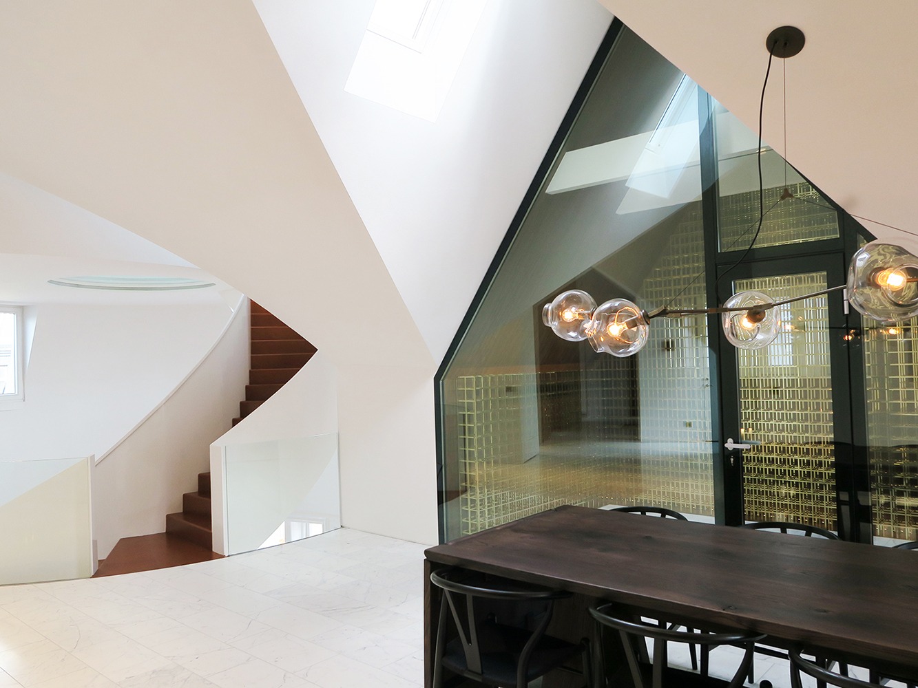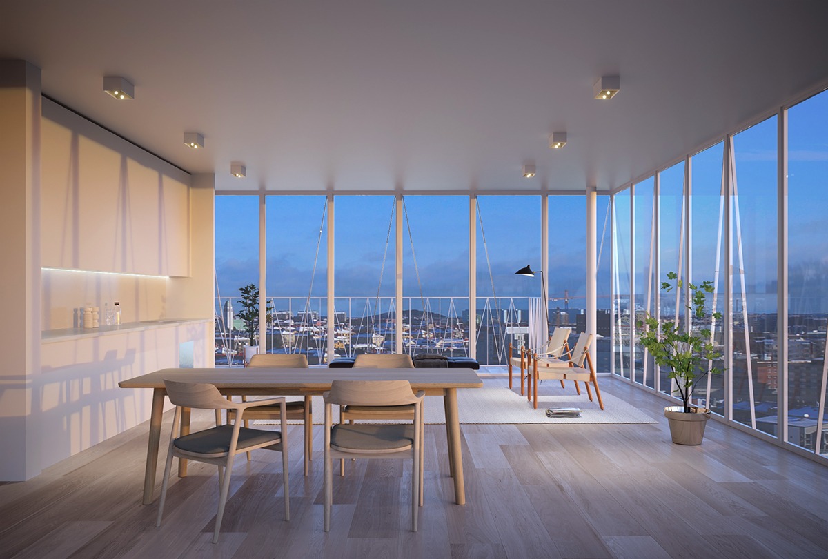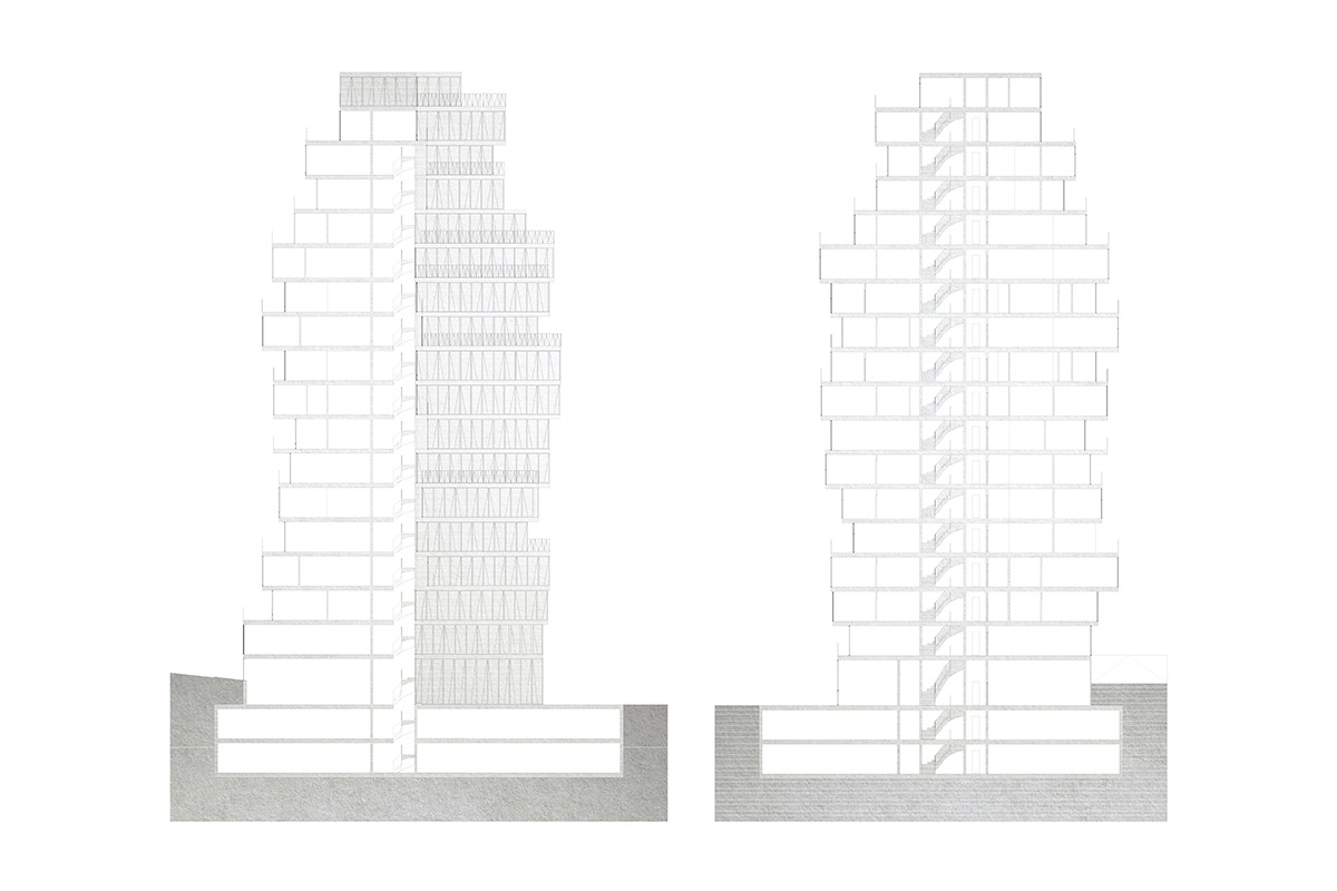 In cooperation with the German climate engineers Transsolar the tower block was designed to be an energy generator. The glass facade is covered in a layer of solar cells. Viewed from the outside, the solar cells add a frosted look that ensures privacy and dampens the influx of daylight. From within, the facade is completely transparent, the solar cells invisible.