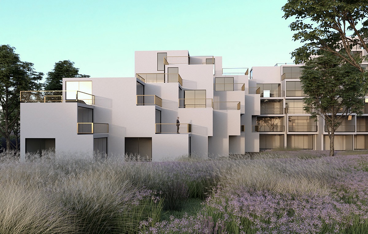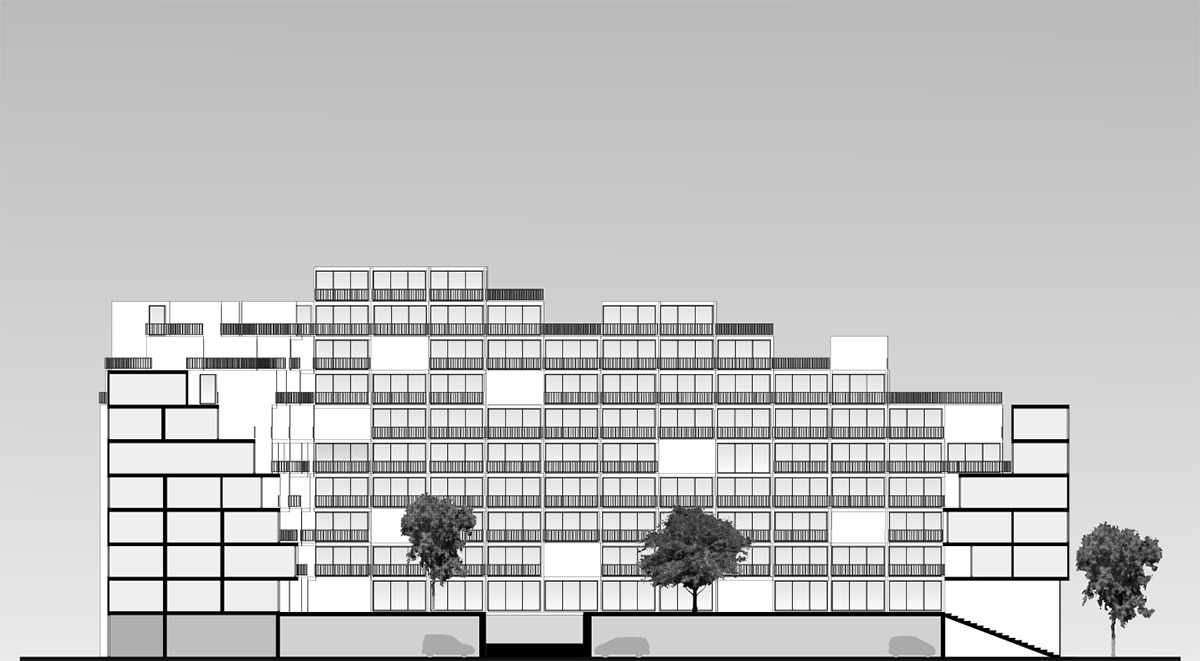 The project is focused on having a strong inherent identity, standing as a solitary structure to be gently incorporated as a landmark in this new district. It operates on a large scale, occupying two residential quarters at the heart of the industrial site. From its maximum height of eleven storeys, the building is terraced down to a single level.
