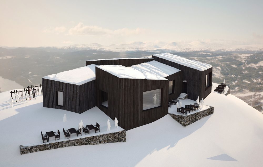 The mountain itself, Funäsdalsberget, towers steeply above the community below. The restaurant was designed as an extension of the natural setting. Like a cluster of rocks. The individual volumes of the restaurant will be clad with different vertical wood panels in shades of brown and grey that relate to the surrounding rocks.